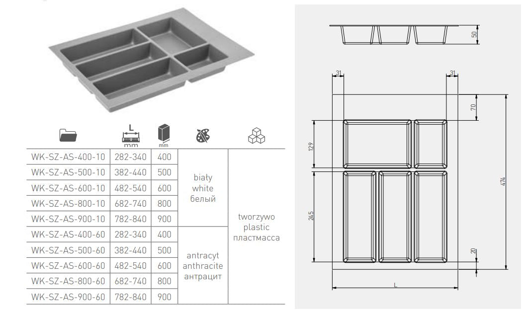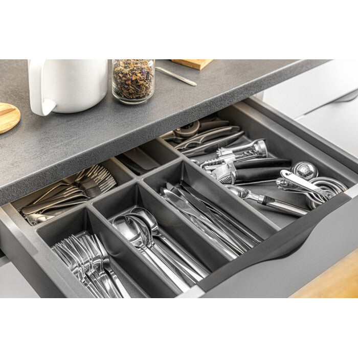 Skuffeinnsatsene i AXISPACE-serien er designet for skuffer med en maksimal bredde på 900 mm. Laget av høykvalitets HIPS-materiale, som er motstandsdyktig mot riper, sprekker og kjemiske midler. Med innsatsen er det enklere å sortere bestikk og småkjøkkentilbehør. Det er også mulig å kutte kantene selv med inntil 58 mm, slik at vi enkelt kan tilpasse det til våre individuelle behov og andre skuffer.
