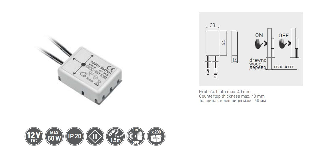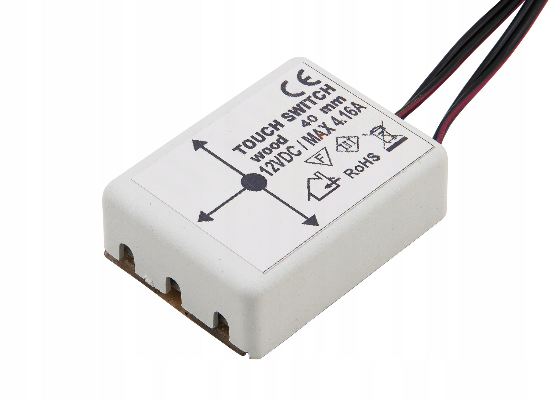 Berøringsfri bryter for montering under benkeplaten. Bryteren lar deg slå lyset av og på uten å berøre det. Bare for hånden nær bryteren for å slå den på. Dette produktet er beregnet for montering under benkeplater med en maksimal tykkelse på 4 cm. Koble LED-belysning til den ene kontakten og 12V DC-strøm til den andre. Bryteren skal kobles til både transformatoren og lyskilden. Maks belastning 50W.