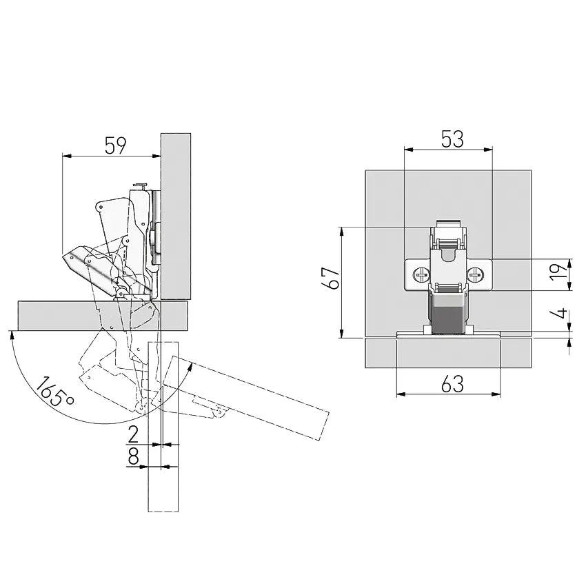 165 graders hengsel som brukes til montering av møbelfronter. Det hydrauliske stempelet sørger for stille og skånsom lukking av døren. CLIP-ON-systemet lar deg demontere hengslet uten at du må benytte ekstra verktøy.
