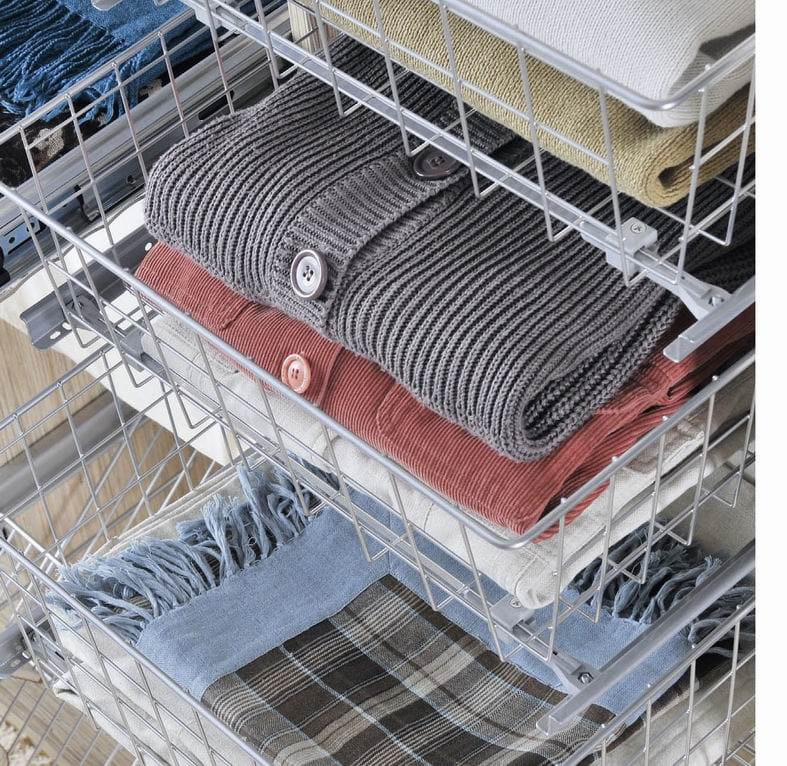 Trådkurvene MD 60/150 er regulerbare i bredden og passer alle skrog som er 560-585mm bredde innvedig. Trådkurven MD leveres i sett med skuffeskinnen H45, som gjør at kurven får et selvlukking system.