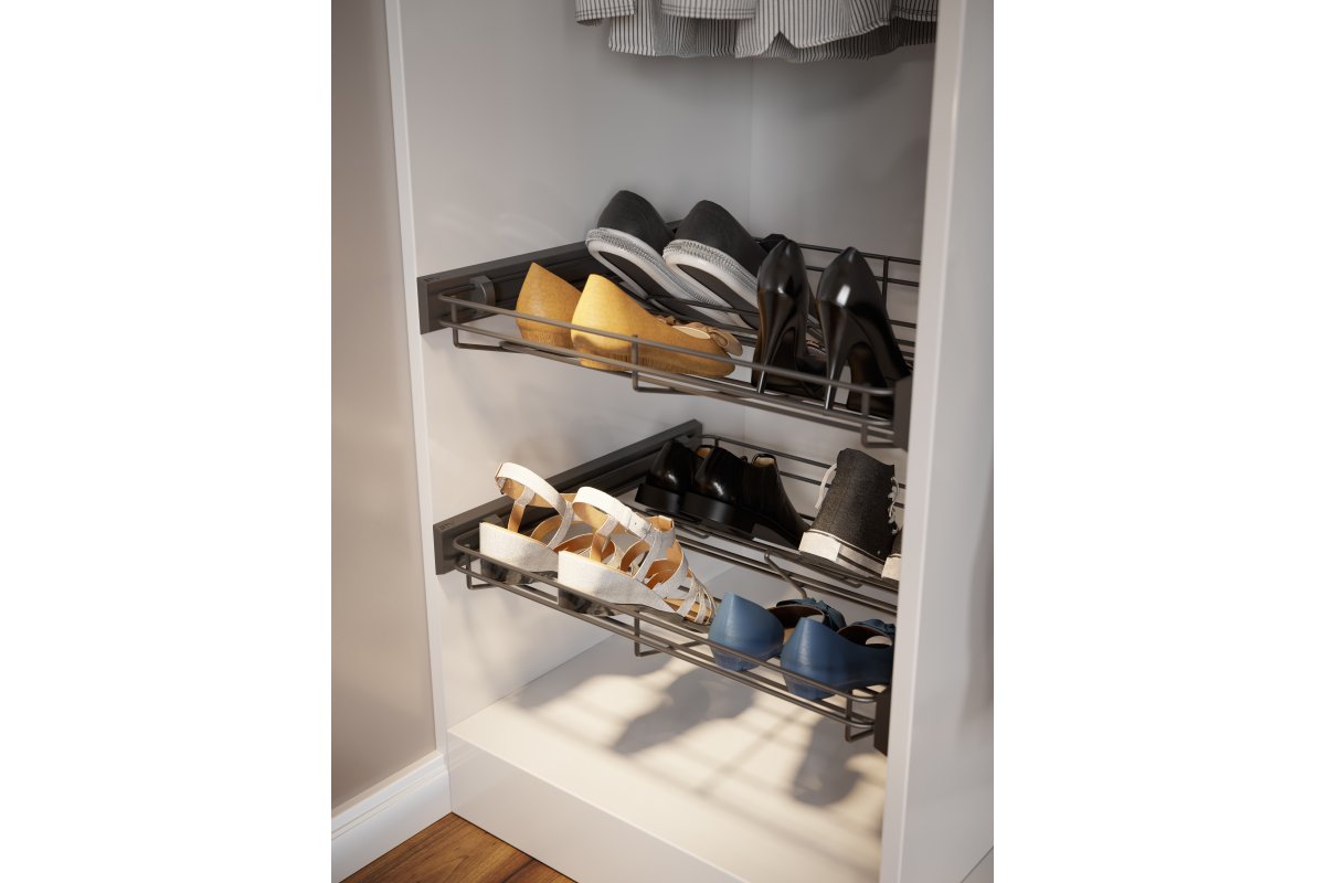 Skoskuffen fra SMART-kolleksjonen er en praktisk løsning for en garderobe eller et moderne omkledningsrom. Utstyrt med to hyller for oppbevaring av sko. Skuffen finnes i 3 bredder til 60cm, 70cm og 80cm skrog. Bredden på skuffen kan justeres i området 560-568 mm, 660-668mm 760-768mm. Tilbudet gjelder skuffeversjon uten skinner (skuffeskinnene må kjøpes separat).