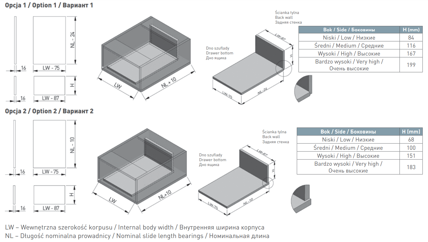 AXISPRO er et skuffesystem som utmerker seg med tyne metal sider med en bredde på 14 mm. Takket være dem får skuffen letthet og et moderne utseende. Systemet har en lydløs lukke funksjon, soft clsoe. Den maksimale lastekapasiteten på opptil 40 kg vil tillate deg å lagre matvarer kjøkken utstyr og egner seg like godt på kjøkkenet som i garderoben.