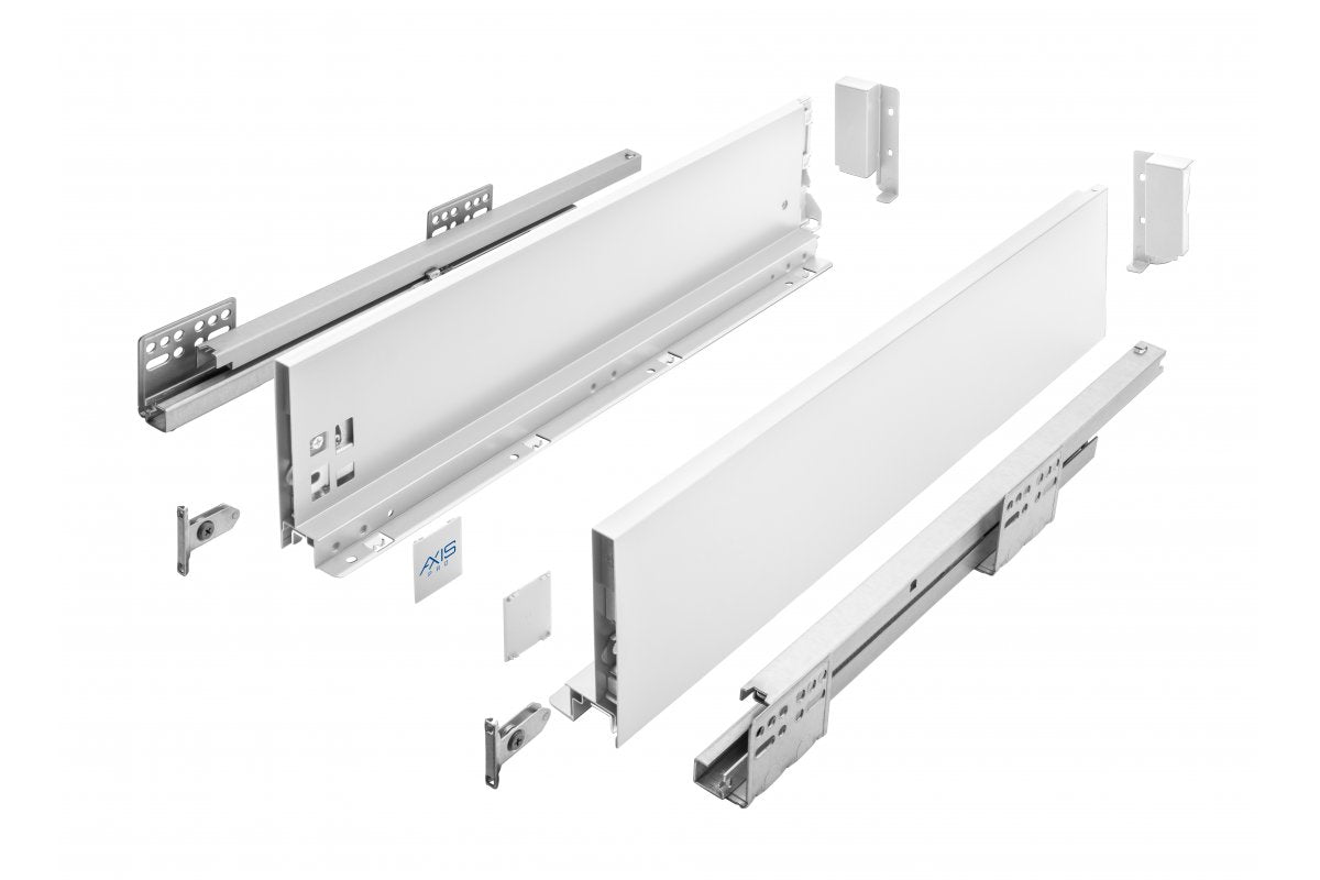 Ved å kjøpe en AXIS PRO skuff får du med side skinner, sidevegger, front braketter, braketter for bakplate, deksler og skruer. AXIS PRO finnes i lengder fra 300mm - 550 samt side høyde fra 84-199mm. Skuffen kommer også i fargen hvit og antrasitt. Som bunn og bakplate brukes 16mm melaminplate.