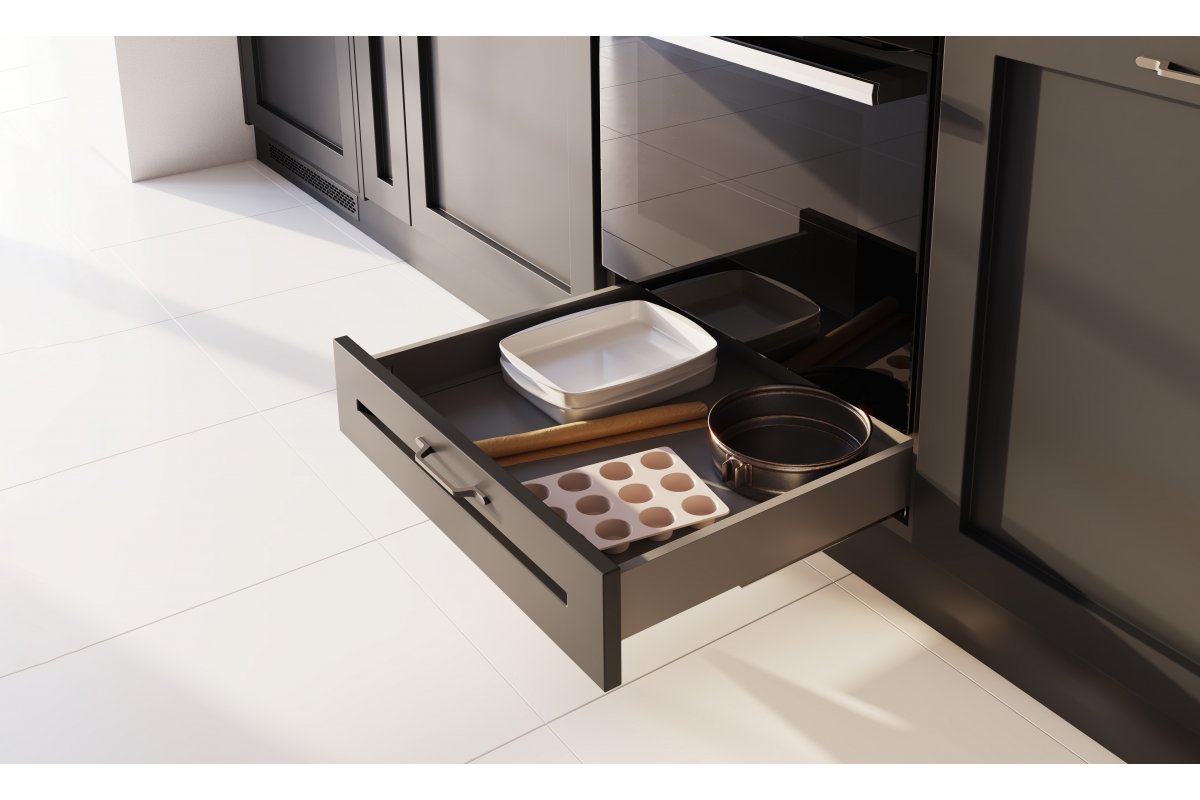 Ved å kjøpe en AXIS PRO skuff får du med side skinner, sidevegger, front braketter, braketter for bakplate, deksler og skruer. AXIS PRO under ovn finnes i 2 lengder fra 450- 500mmog har en sidehøyde på 69mm. Skuffen kommer også i fargen hvit og antrasitt. Som bunn og bakplate brukes 16mm melaminplate.